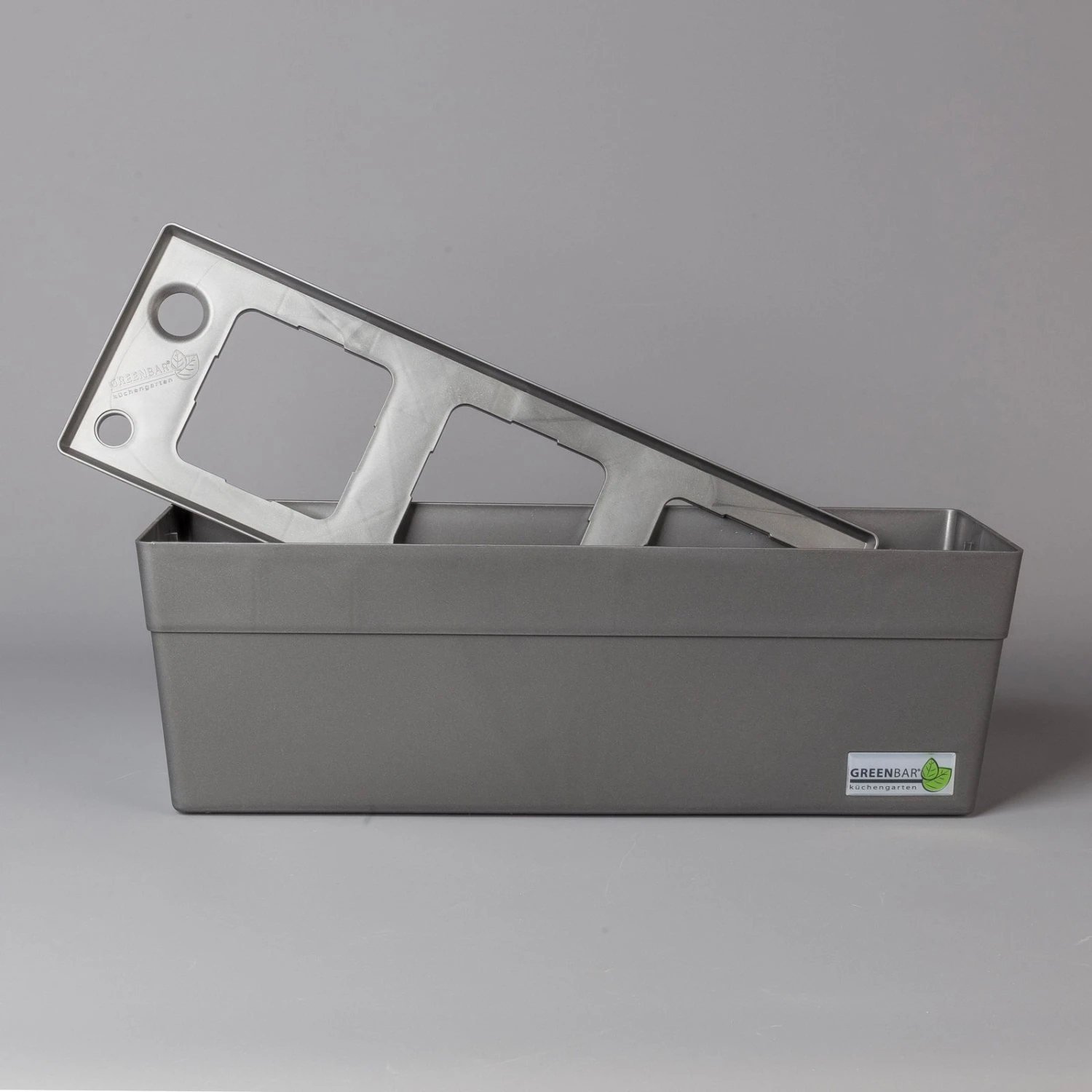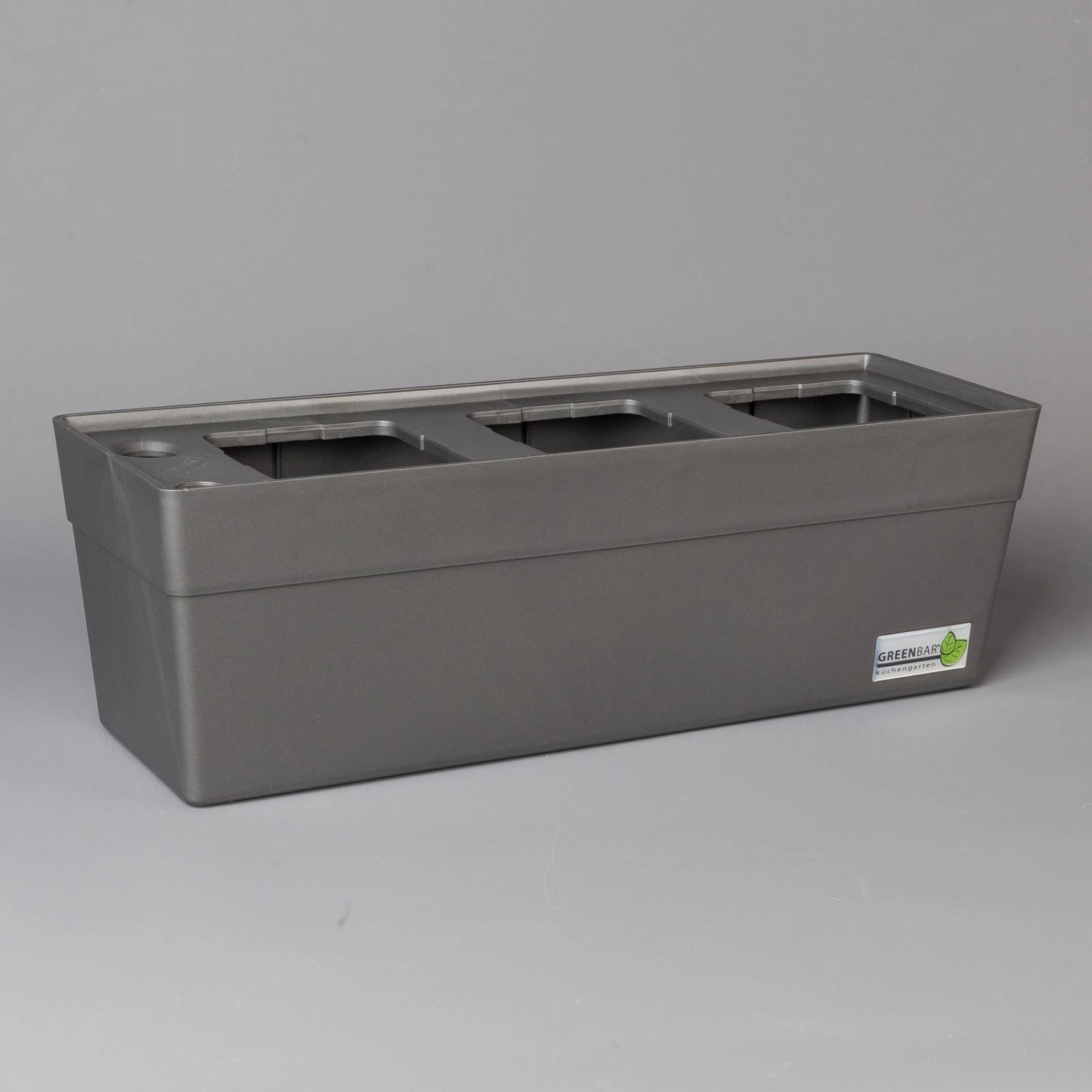 Die Greenbar® ermöglicht eine äußerst pflegeleichte Kultur verschiedenster Gemüsepflanzen und Kräuter. Über ein integriertes Bewässerungssystem werden sie mit der optimalen Menge an Wasser und Nährstoffen versorgt. Die Pflanztöpfe werden hierzu auf ein spezielles Bewässerungsvlies in die Greenbar® gestellt und der Wasserhaushalt ganz einfach über ein Einfüllloch und eine Wasserstandsanzeige geregelt. Um Staunässe und eine Schädigung der Wurzeln zu vermeiden, sollte der Wasserstand nicht permanent genau zwischen ‚Min‘ und ‚Max‘ liegen, sonder eher in Zyklen zwischen Nass und Trocken oszillieren. Ein regelmäßiges Abtrocknen des Substrats ist förderlich, ein völliges Austrocknen hingegen nicht. Fällt der Wasserstand dauerhaft unter ‚Min‘, vertrocknen die Pflanzen und werden nicht mehr mit den nötigen Nährstoffen versorgt, überschreitet der Wasserstand ‚Max‘ für längere Zeit ist für die Pflanze nicht genug Sauerstoff verfügbar. Zum guten Gedeihen brauchen die Grillkräuter in der Greenbar® lediglich einen sonnigen Standort drinnen oder draußen am Fenster, auf dem Balkon oder der Terrasse.