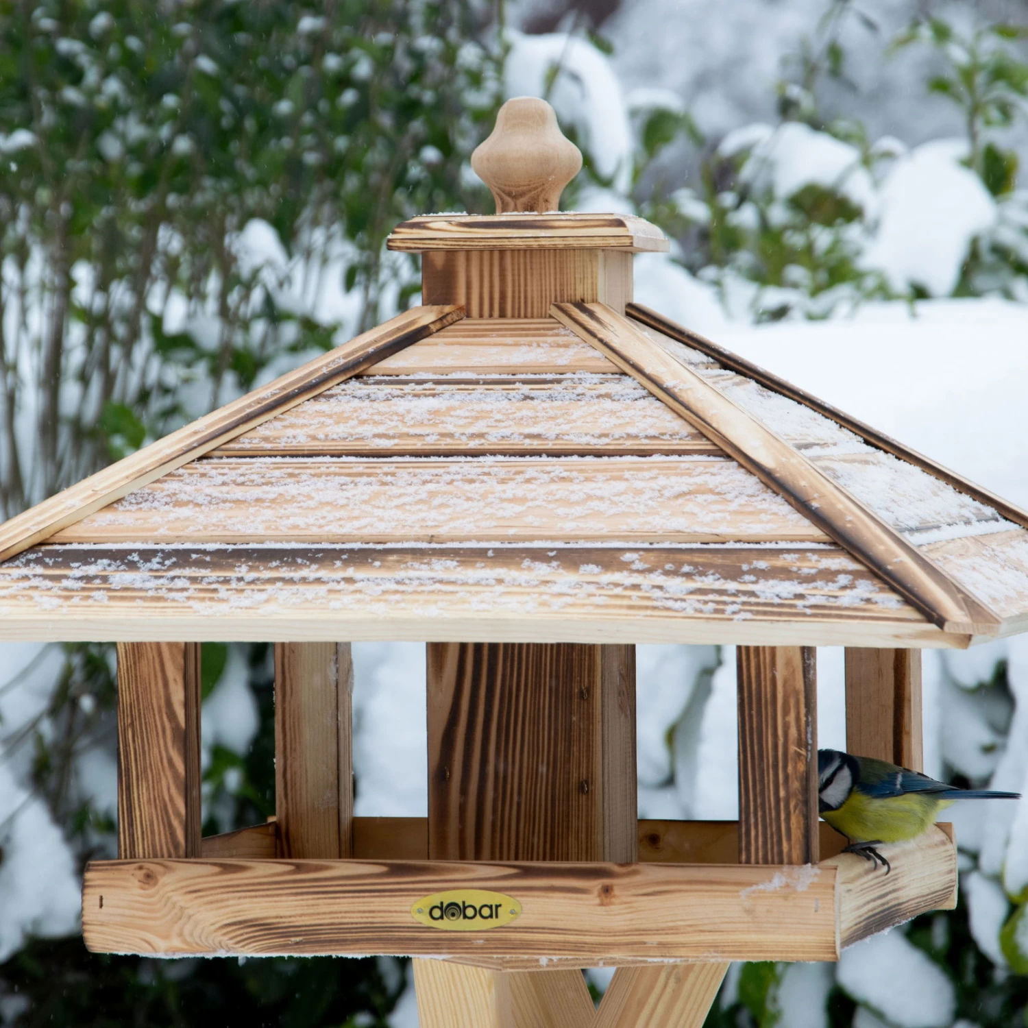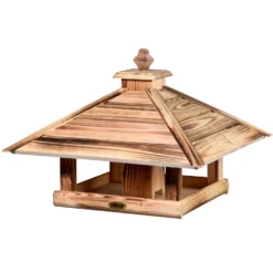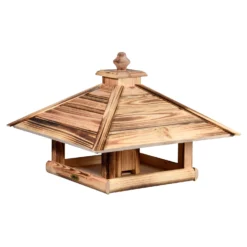Das Vogelfutterhaus ‚Heat‘ versorgt die Wildvögel mit schmackhaften Sämereien und wird daher rund ums ganze Jahr frequentiert. Dieses rustikale Futterhäuschen aus geflammtem FSC®-zertifiziertem Kiefernholz eignet sich zum Aufstellen oder zur Montage auf einem Ständer. Besonders praktisch ist das Futtersilo, welches die Leckereien vor Wind und Feuchtigkeit schützt.